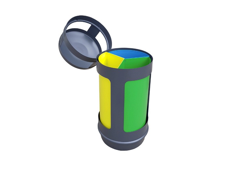 Papelera metálica preselección con cabezal, para 1, 2, 3 o 4 residuos separados por cubetas de chapa galvanizadas independientes y extraíbles con el color de los diferentes residuos. Cabezal para evitar que entre el agua de lluvia en los compartimentos de residuos y la sustracción de las cubetas. Anclaje al suelo mediante tornillos.